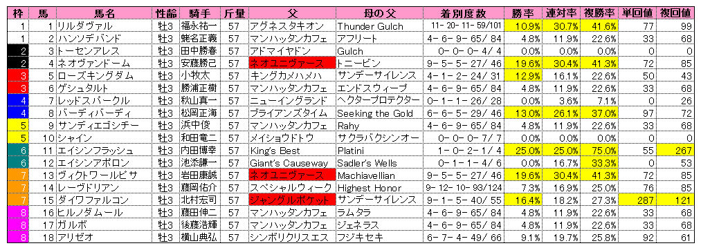 あとは◎と同じネオユニヴァース産駒を評価してヴィクトワールピサと皐月賞で活躍している前走若葉S組のヒルノダムールまで抑えます。